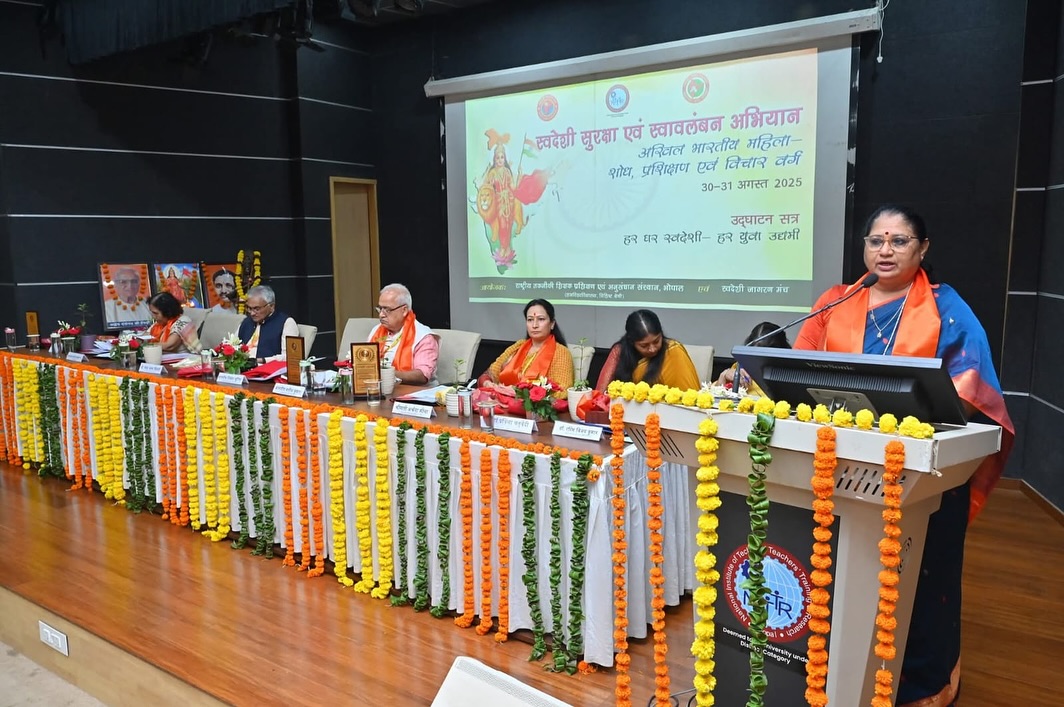 भोपाल। NITTTR भोपाल एवं स्वदेशी जागरण मंच के संयुक्त तत्वावधान में 30-31 अगस्त 2025 को “अखिल भारतीय महिला–शोध, प्रशिक्षण एवं विचार वर्ग” का भव्य आयोजन हुआ। कार्यक्रम का मुख्य उद्देश्य महिलाओं की सक्रिय भूमिका को प्रोत्साहित करना और स्वदेशी कार्यों को नई गति देना था। इस अवसर पर देशभर से 175 से अधिक प्रतिभागियों ने भाग लिया। महिला उद्यमियों, शोधकर्ताओं और सामाजिक कार्यकर्ताओं ने कार्यशालाओं, प्रशिक्षण सत्रों और संवाद के माध्यम से अपने ज्ञान और कौशल को समृद्ध किया। उद्घाटन सत्र में मुख्य अतिथि श्रीमती निर्मला भूरिया (मंत्री, महिला एवं बाल विकास, म.प्र.) सहित अनेक गणमान्य अतिथि उपस्थित रहे। कार्यक्रम का सफल समन्वयन डॉ. पल्लवी भटनागर ने किया। यह आयोजन महिला सशक्तिकरण, आत्मनिर्भरता और स्वदेशी अभियान की दिशा में एक ऐतिहासिक कदम साबित हुआ।