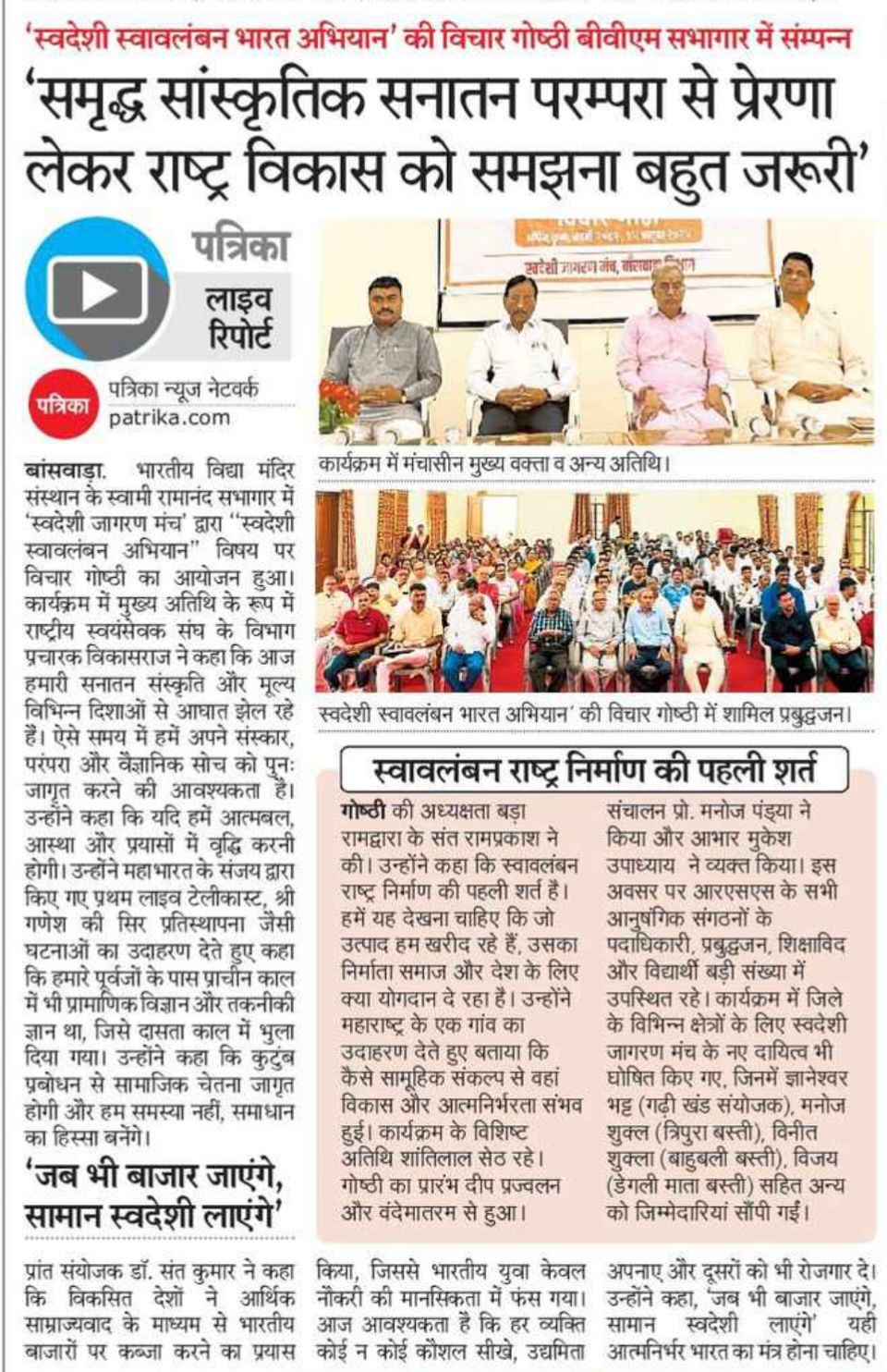 भारतीय विद्या मंदिर संस्थान के स्वामी रामानंद सभागार में स्वदेशी जागरण मंच द्वारा 'स्वदेशी जागरण मंच' द्वारा स्वदेशी स्वावलंबी भारत अभियान विषय पर विचार गोष्ठी का आयोजन हुआ कार्यक्रम में मुख्य अतिथि के रूप में राष्ट्रीय स्वयंसेवक संघ के प्रचारक श्रीमान विकास राज जी और मुख्य वक्ता डॉ. संत कुमार जी प्रांत संयोजक स्वदेशी जागरण मंच चित्तौड़ प्रांत (राजस्थान),गोष्ठी की अध्यक्षता बड़ा राम द्वारा के संत रामप्रकाश जी ने की।